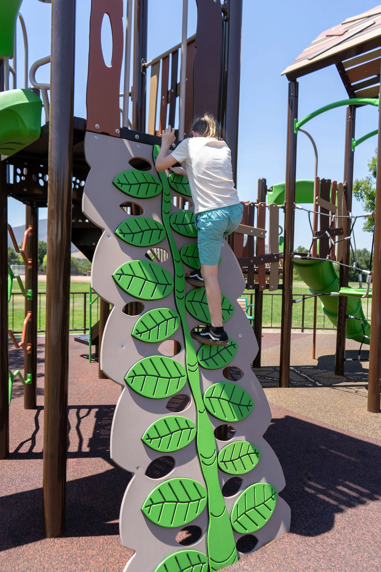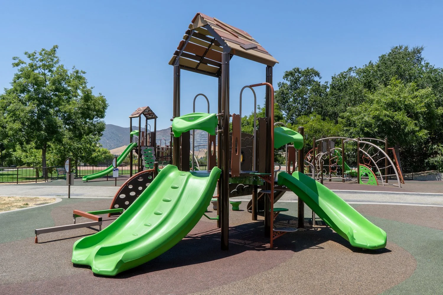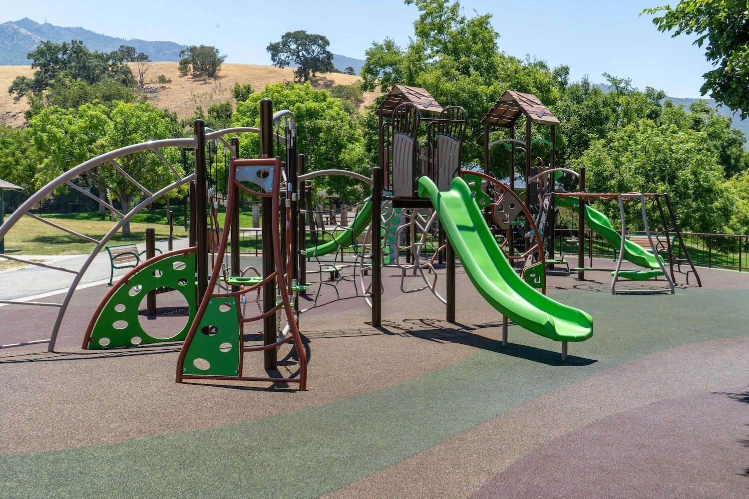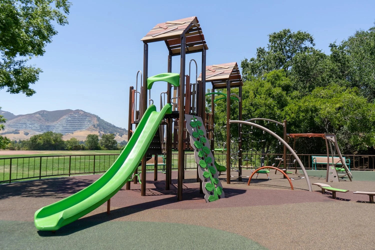 A brand new SPEC park in Clayton has opened to the public! At Clayton Community Park there are two inclusive playgrounds for ages 5-12 and 2-5 with a beautiful mountain backdrop. The 5-12 playground is equipped with a viper slide, leaf climber, Taktiks Rope Wall, Apex Wave climber, and Plexus Overhead monkey bars. The 2-5 playground features a Velo slide, Z Balance Beam, and play panels including the Bee Accessible Reach and Rain Wheel.