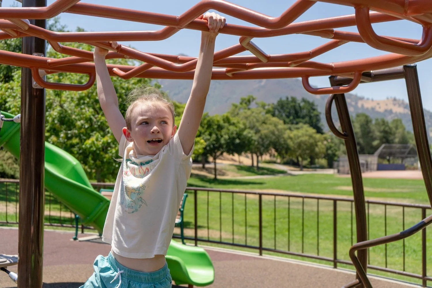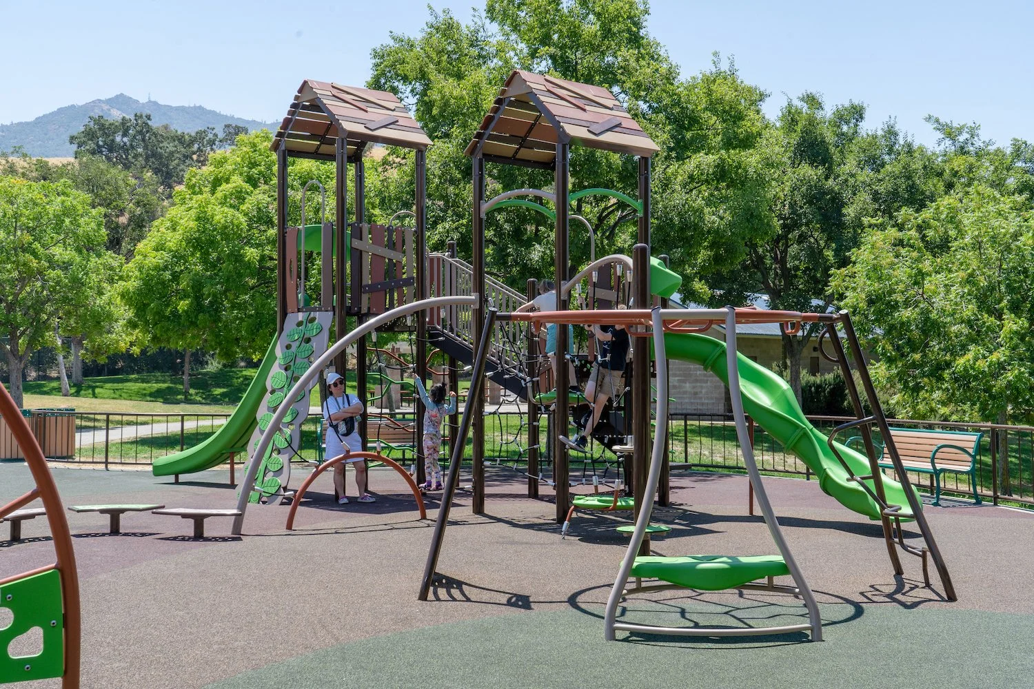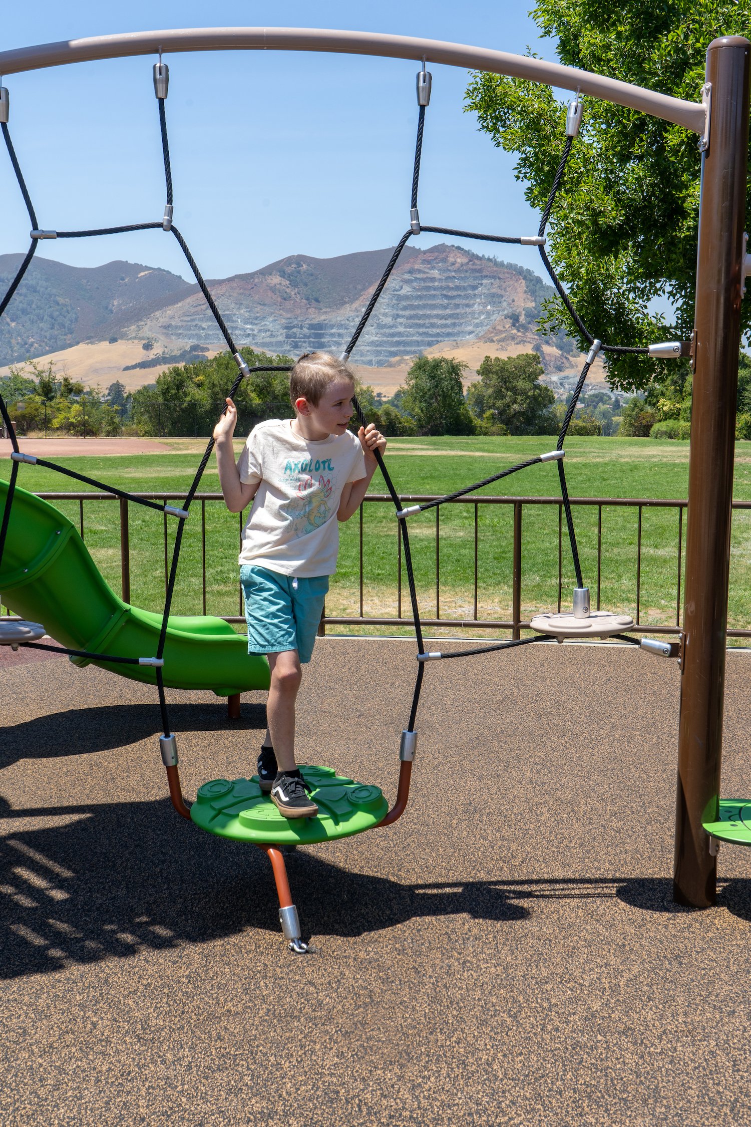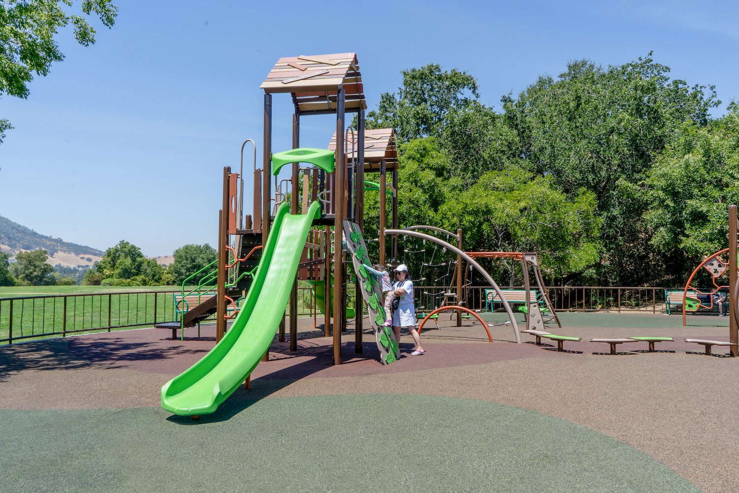 A brand new SPEC park in Clayton has opened to the public! At Clayton Community Park there are two inclusive playgrounds for ages 5-12 and 2-5 with a beautiful mountain backdrop. The 5-12 playground is equipped with a viper slide, leaf climber, Taktiks Rope Wall, Apex Wave climber, and Plexus Overhead monkey bars. The 2-5 playground features a Velo slide, Z Balance Beam, and play panels including the Bee Accessible Reach and Rain Wheel.